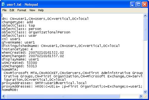 In Active Directory terminology a user is an object of class "user". To an Exchange administrator this definition may need to be broadened to include all objects that are listed at the address book. However to begin with let's have a look at how a user looks like when exported using the LDIFde.exe command:ldifde -f c:\temp\user1.txt -d cn=user1,cn=users,dc=vertical,dc=local -v